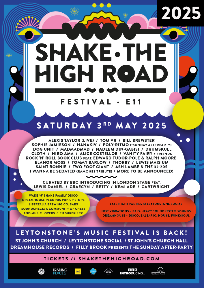 May 2025’s sold-out SHAKE THE HIGH ROAD was another magical and unforgettable day in Leytonstone E11! From packed sets in the beautiful surroundings of St Johns Church from the likes of Alexis Taylor and Tom VR, to both floors of The Leytonstone Social rocking to MADMADMAD, Dog Unit, and many many more – it was a truly special day of music. A huge thanks to the 750 amazing people from Leytonstone and further afield who joined us to create such a vibrant atmosphere, our wonderful team of staff and volunteers, and of course, the incredible artists who performed sets that will be remembered for a long, long time.