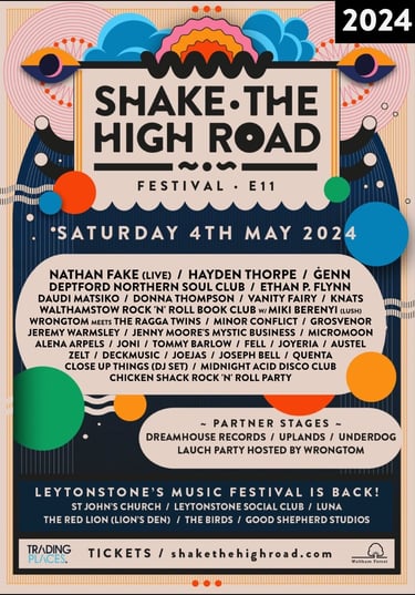 In 2024 SHAKE THE HIGH ROAD was back with a bang, featuring Nathan Fake, Hayden Thorpe, GENN, Daudi Matsiko and many more playing. A sold-out event with 700 people witnessing unforgettable shows, hosted in the magnificent St John’s Church for the first time, plus across both floors of the wonderful Leytonstone Social and once again back at the The Luna, which sadly closed shortly after this.
