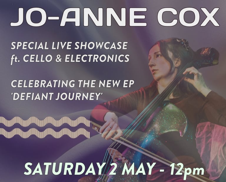 Jo-anne Cox is a boundary-defying performer/composer based in London. She is neurodivergent and plays a sparkling purple ‘dragon cello’, a symbol of power and resistance defying society’s expectations to fit the norm, blending the warmth of strings with magical electronic textures, dance rhythms, and evocative melody lines.